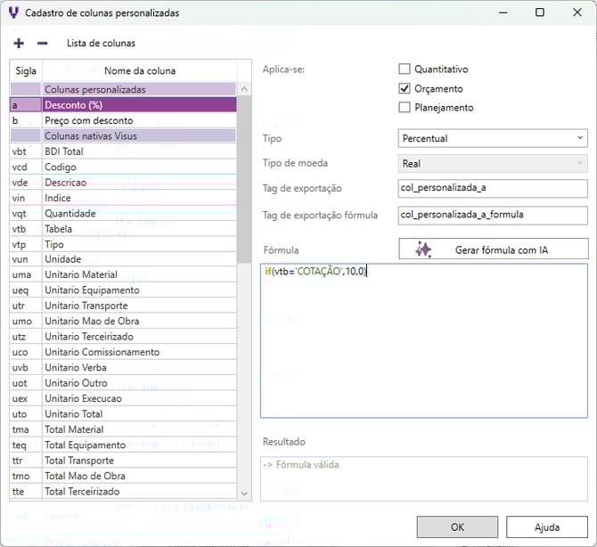 - Fórmula - Caso 2: utilizar IA para descrever uma fórmula condicional (IF) baseada no parâmetro e dado que deseja utilizar para aplicar o desconto, dentre os parâmetros disponíveis das colunas nativas do Visus. No exemplo abaixo, informamos uma fórmula condicional para aplicar desconto nas composições de uma tabela específica de cotação com um fornecedor, assim, todas os itens onde utilizou-se o preço do fornecedor, tem um desconto de 10% (valor arbitrário) e outras tabelas não considerou-se descontos (0%).