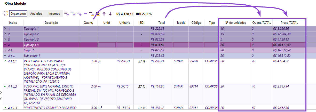 As colunas aparecerão nas listas de quantitativos e orçamento com os valores já multiplicados pelo número de unidades de cada tipologia.