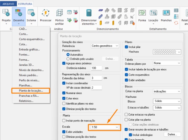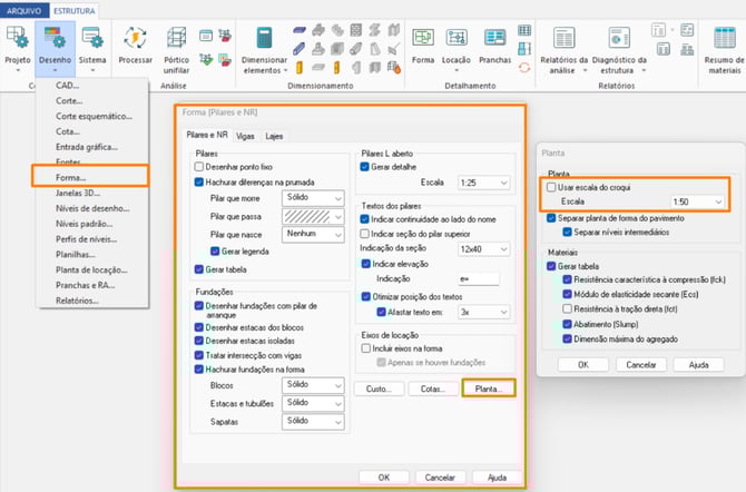 Observação: Após realizar essa configuração, é necessário atualizar a planta de forma para aplicar a nova escala. Para isso, siga os procedimentos descritos no artigo Planta de fôrma diferente do croqui.