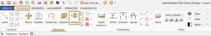 O comando Alinhar está disponível na Guia Desenhos, dentro do Grupo Manipular. Utilize esse caminho para localizar e executar a ferramenta no ambiente de edição.