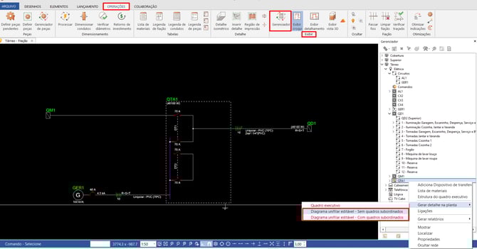 - Na janela Gerenciador, clicar com o botão direito no quadro de transferência desejado e selecionar Gerar detalhe na planta - Diagrama unifilar editável - xxxx: