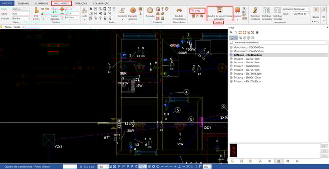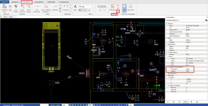 Na janela propriedades, Quadro de transferência, selecione o Pavimento e o Quadro referente ao QTA desejado: