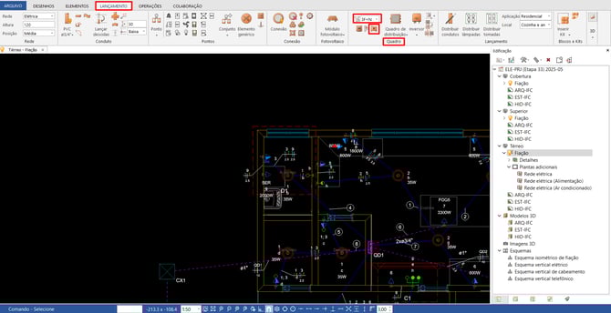 Por fim, basta processar o projeto, assim como indicado no material Como processar o dimensionamento no módulo Elétrico do AltoQi Builder. Assim, o dimensionamento será realizado e as fiações devidamente inseridas no projeto: