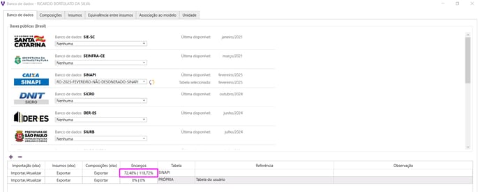 Os usuários poderão definir o percentual de encargos sociais que incidem para os insumos de mão de obra do banco desejado, nas duas modalidades: horista e mensalista.
