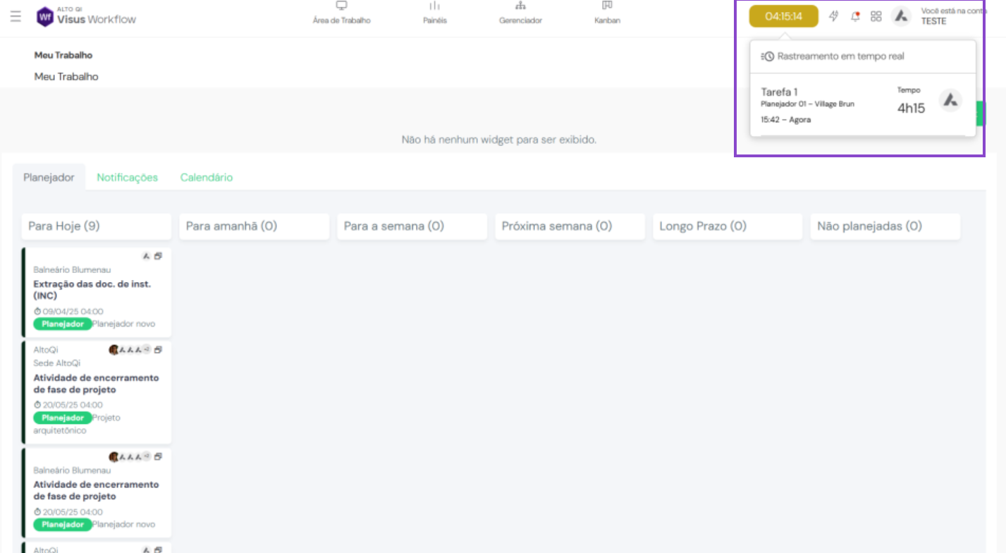 A nova interface de rastreamento em tempo real garante visibilidade contínua das tarefas com cronômetro ativo, tanto para colaboradores quanto para gestores. O recurso exibe o cronômetro diretamente na barra superior do sistema, permitindo acompanhar o tempo em execução sem interromper o fluxo de trabalho e acessar rapidamente os detalhes da tarefa. Com isso, há mais controle, foco e precisão no registro de horas, além de maior eficiência na gestão da produtividade e tomada de decisão em tempo real.