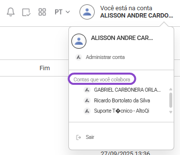 - Clique sobre seu avatar e acesse a conta que colabora (caso usuário definido como Administrador da conta)