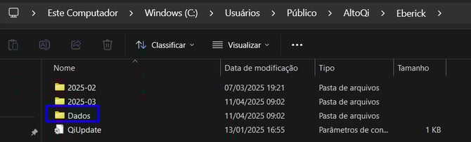 💡 Dica Suporte: Para preservar as informações salvas pela Inteligência Artificial durante o processo de reinstalação do Eberick, basta manter em sua máquina a pasta "Dados", localizada em Disco local C: > Usuários > Público > AltoQi > Eberick, conforme a imagem a seguir: