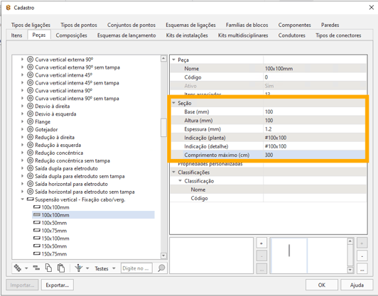 Não há limitação quanto ao tamanho da simbologia cadastrada. Por exemplo, é possível modelar um trecho com 600 cm. No entanto, o valor informado no campo deve coincidir exatamente com o comprimento modelado, pois é com base nesse valor que o programa realizará a repetição e o corte automático ao longo do conduto.