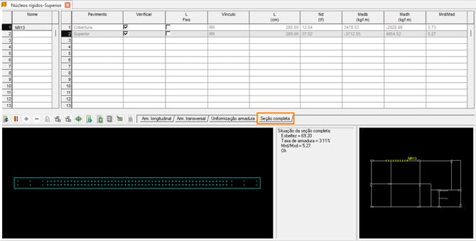 O Eberick realiza o dimensionamento e detalhamento do Núcleo Rígido com base nos resultados obtidos através da análise com elementos finitos e de acordo com as normas brasileiras.
