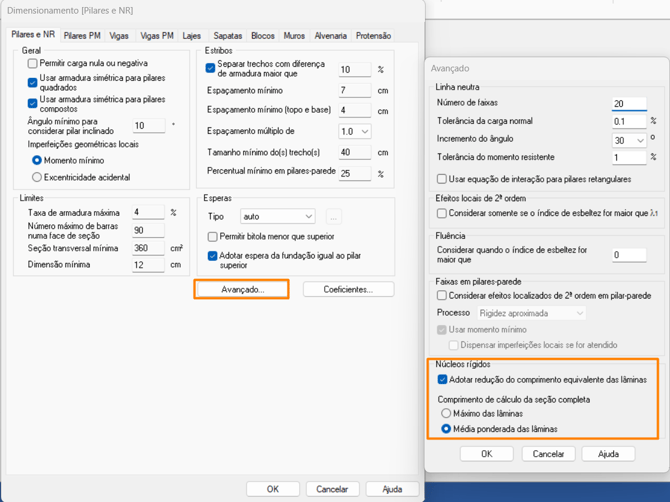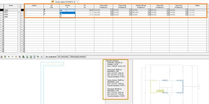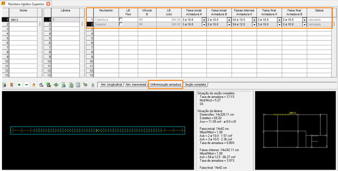 Será possível acessar a janela de dimensionamento dos Núcleos Rígidos, que possui colunas que possibilitam a alteração do vínculo e comprimento de flambagem, bem como a e conferência do resultado de dimensionamento de cada lâmina.