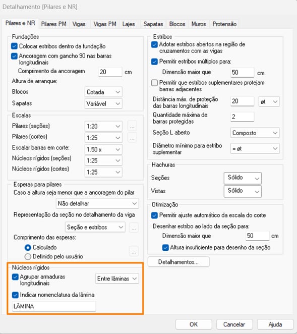 Foram inseridas opções de configurações de dimensionamento e detalhamento, disponíveis na aba Estrutura, grupo Configurações > Projeto > Dimensionamento/Detalhamento, aba Pilares e NR: