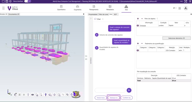 Os elementos filtrados na consulta podem ser rastreados no modelo utilizando o comando: Destacar no 3D.