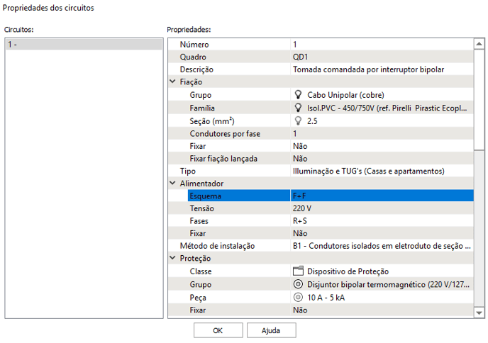 - No diálogo Propriedades dos circuitos determine as propriedades desejadas;