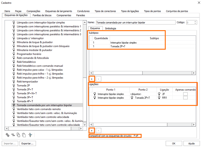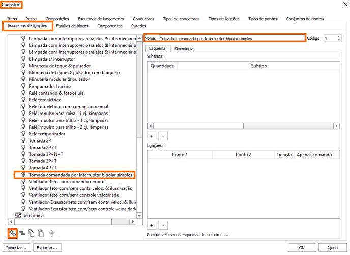 - Para o cadastro de um novo esquema de ligação o usuário pode utilizar os Tipos de pontos e Tipos de ligações existentes no programa ou também pode cadastrar novos.