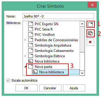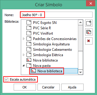 - Defina um nome para a simbologia, selecione a biblioteca criada, habilite a opção “Escala automática” e clique em “Ok”.