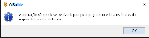 Portanto, ao tentar lançar elementos fora da região de trabalho já existente, a seguinte mensagem é exibida: "A operação não pode ser realizada porque o projeto excederia os limites da região de trabalho definida." e o lançamento não é realizado.