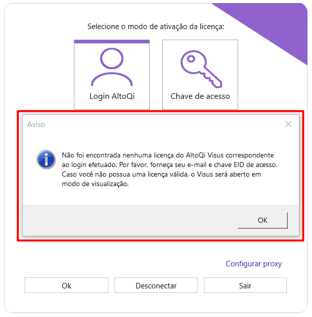 Então, ao finalizar esse processo, aguarde enquanto o acesso é identificado e associado à sua conta. Ao término aparecerá uma mensagem informando que não há licença no cadastro, mas que o mesmo poderá ser utilizado normalmente para visualização, conforme imagem a seguir. Clique em ok para confirmar.