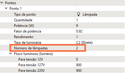 . Será criado o Ponto 1; - Selecione o tipo de ponto como Lâmpada e defina as propriedades de quantidade, potência, fator de potência, rendimento, tipo de luminária, número de lâmpadas e fluxo luminoso de acordo com o catálogo da lâmpada escolhida;