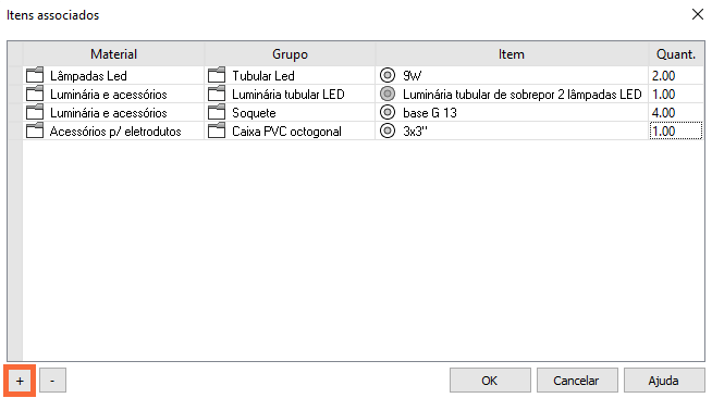 O próximo passo será associar os itens necessários para a instalação da Lâmpada LED - Tubular (Taschibra) - 2x9 W (que serão contabilizados na lista de materiais). Para isso: