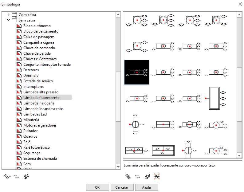 - No diálogo Simbologia selecione a Classe e o Grupo onde encontra-se o símbolo desejado, por exemplo Simbologia Elétrica – Sem caixa – Lâmpada fluorescente;