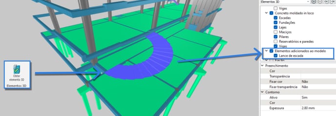 Caso deseje incluir elementos contidos em um IFC vinculado, com o IFC estrutural do projeto, através do comando de "Obter elemento 3D" é possível selecionar o elemento em questão para exportação junto do modelo: