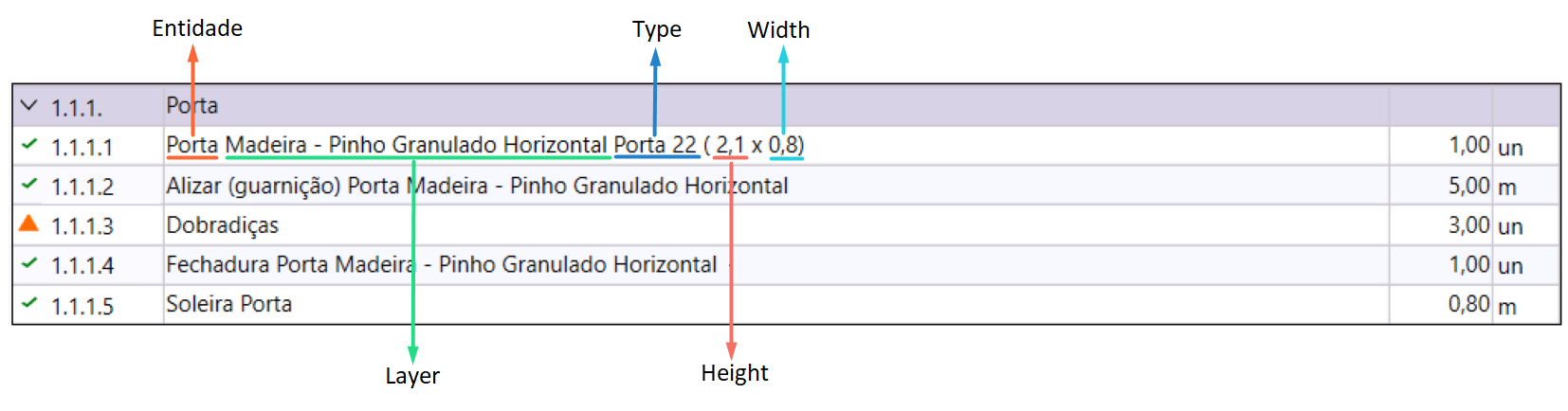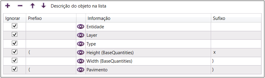 Note que, à direita, o AltoQi Visus apresenta uma tabela chamada Descrição do objeto na lista. É nessa tabela que serão definidas as propriedades para compor o nome do item no quantitativo. Note que, para o caso acima, Porta, é utilizada a sua Entidade, Layer, Type, Height e Width.