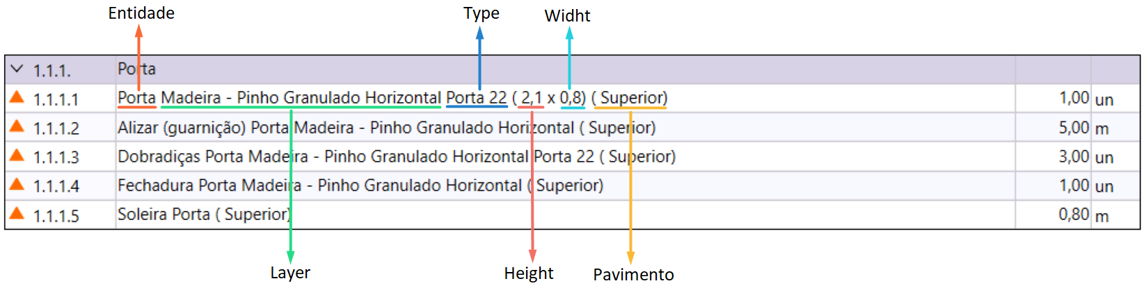 Esses itens são extraídos das propriedades de cada elemento. Caso selecionemos um item no quantitativo e acessemos suas propriedades, veremos que, para as propriedades abaixo, teremos a descrição Porta Madeira - Pinho Granulado Horizontal Porta 22 (2,1 x 0,8). Note que o programa atribui o formato Entidade - Layer - Type - Height - Width para a descrição do item.
