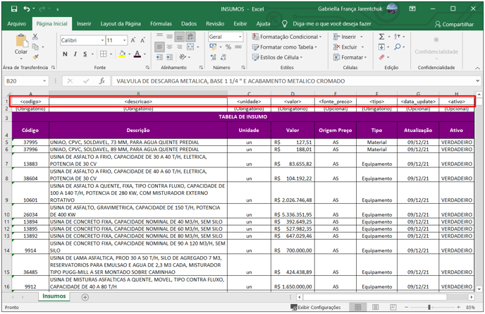 <ativo> Utilizada para definir a coluna que contém a informação do status dos insumos. (esta coluna é opcional)