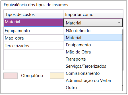 Na sequência, defina no painel de Equivalência dos tipo de insumos, o tipo de insumo que estão sendo importados. Para o nosso exemplo, vamos importa-los como Material. Após selecionar, clique em concluir para confirmar a importação da tabela.