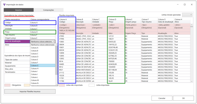 No painel de Equivalência das colunas importadas, para cada Dado Necessário, vamos atribuir a sua Coluna Correspondente, em nosso exemplo, os códigos do insumo estão relacionados na coluna "A". da planilha eletrônica. Sendo assim:
